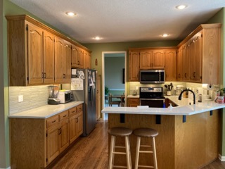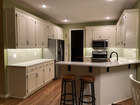 Riley Design KC, Kansas City’s premier cabinet painting company, recently transformed a kitchen in Overland Park, KS, by giving outdated golden oak cabinets a fresh, modern look. Specializing in high-quality cabinet refinishing, our expert team meticulously prepped and painted the cabinets a timeless white, creating a bright and elegant aesthetic. Our cabinet painting process ensures a factory-smooth finish that enhances durability and longevity, providing homeowners with a cost-effective alternative to cabinet replacement. Whether you're looking to update your kitchen, bathroom, or built-ins, Riley Design KC brings professional craftsmanship and attention to detail, delivering results that exceed expectations. This Overland Park kitchen is now a stunning showcase of our superior cabinet painting services, and our client couldn’t be happier with the transformation.