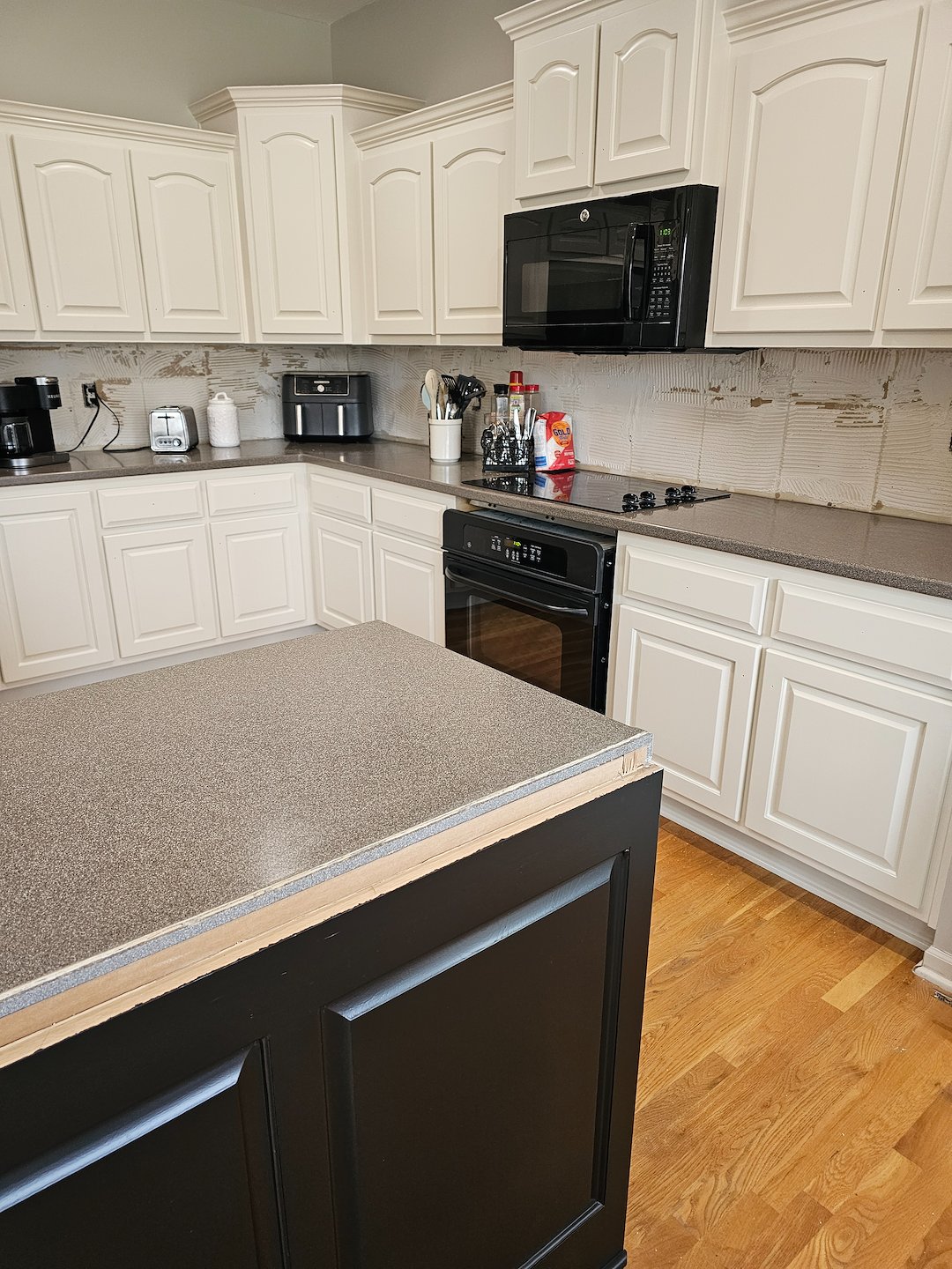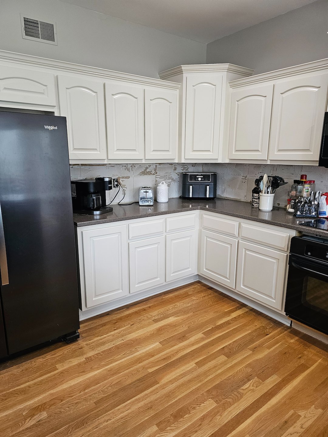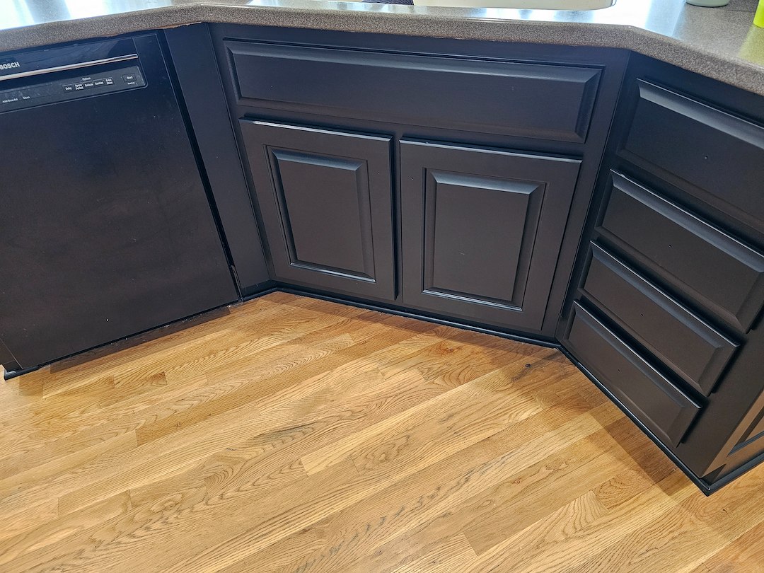 Riley Design KC, Kansas City’s premier cabinet painting company, recently completed a stunning kitchen transformation in Overland Park, KS. Specializing in high-quality cabinet refinishing, our team revitalized this kitchen by painting the maintenance cabinets in a timeless off-white shade, while the island received a bold, modern black finish. To enhance both functionality and aesthetics, we also installed hidden soft-close hinges, giving the cabinetry a seamless, high-end touch. With meticulous attention to detail and premium-grade materials, our expert painters ensured a flawless, durable finish that enhances the overall elegance of the space.